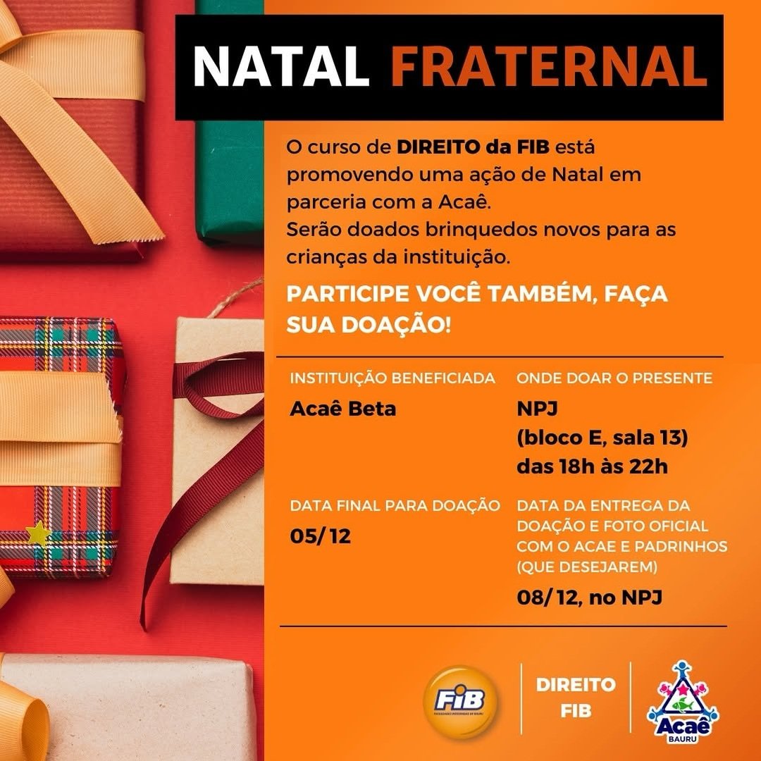 O curso de Direito das Faculdades Integradas de Bauru (FIB) está realizando uma ação especial de Natal que promete levar alegria e esperança às crianças atendidas pela instituição Acaê, uma instituição sem fins lucrativos que atua em Bauru com iniciativas voltadas à promoção da convivência comunitária, do fortalecimento de vínculos sociais e da proteção de pessoas em situação de vulnerabilidade.