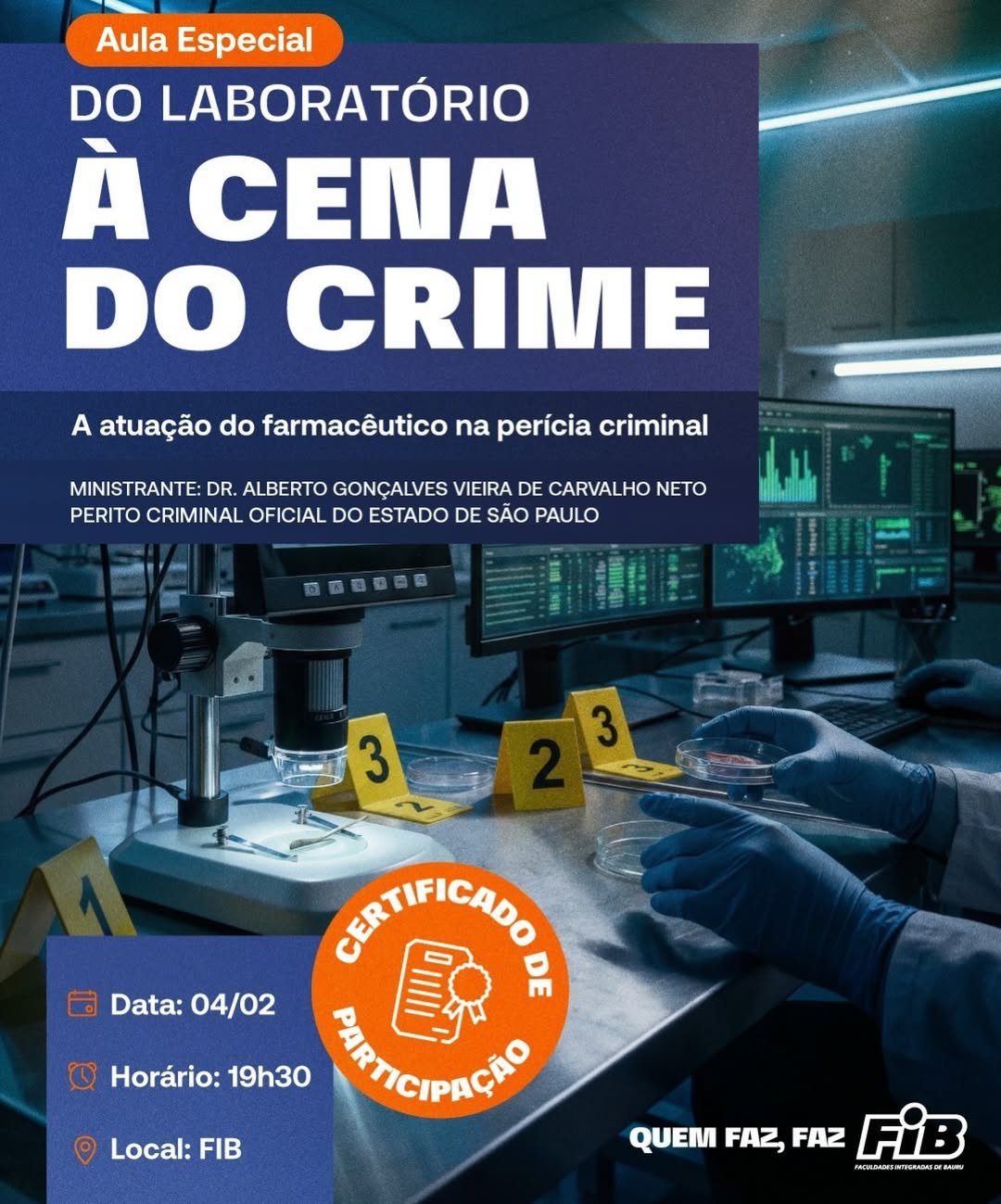 O curso de Farmácia das Faculdades Integradas de Bauru (FIB) realiza nesta quarta-feira (04), uma Aula Especial com o tema “Do Laboratório à Cena do Crime: a atuação do farmacêutico na perícia criminal”, reforçando a proposta de ensino que integra teoria, prática e mercado profissional.