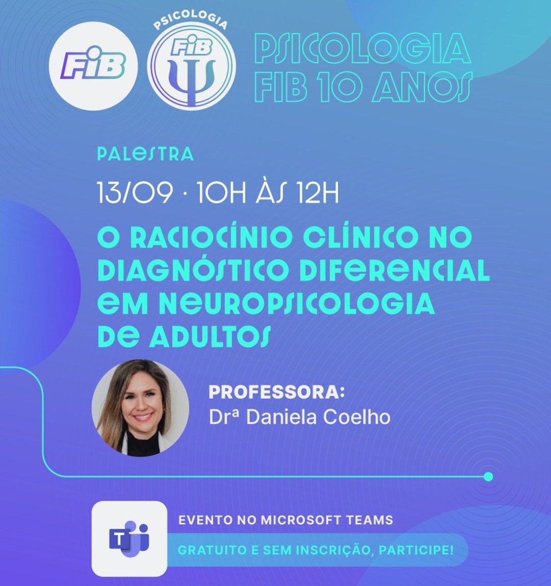 As Faculdades Integradas de Bauru (FIB) seguem com a programação especial em comemoração aos 10 anos do curso de Psicologia. Neste sábado (13), das 10h às 12h, será realizada a palestra "O raciocínio clínico no diagnóstico diferencial em neuropsicologia de adultos", ministrada pela professora Dra....